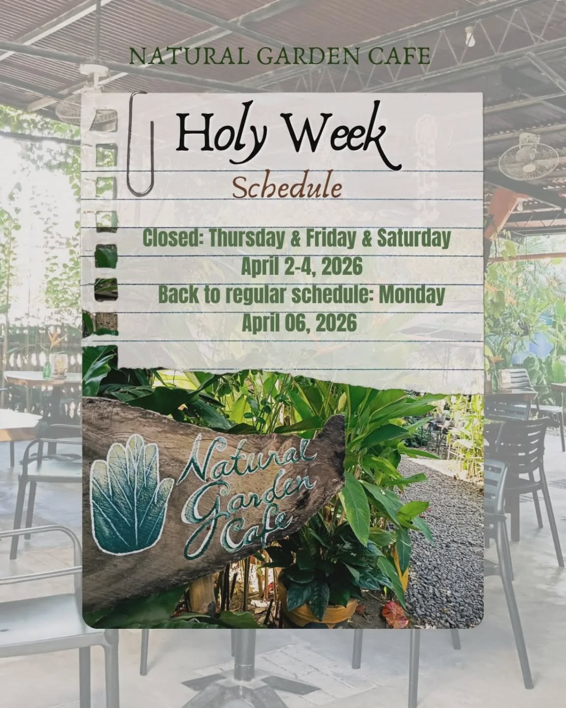 Please call 0995 621 4750 or 034 445 7845 for advance orders and reservations and email us at ngcbacolod@gmail.com for inquiries. Our hours are Monday through Friday, from 9am to 5 PM. Last orders are at 4:30 PM. We deliver from our Bacolod location for orders of 10 full lunches or more. Speak with our managers for more information.